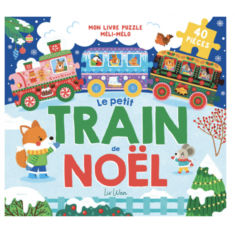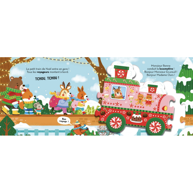 Les animaux de la forêt montent dans le train de Noël. Ils vont à la patinoire, à l’opéra, au marché de Noël… L’histoire est adorable et les 40 pièces de ce train-puzzle s’assemblent dans tous les sens pour favoriser l’imagination. Les pages du livre et les pièces du puzzle sont en carton épais. Une fois assemblé, le puzzle mesure 90 cm de long.