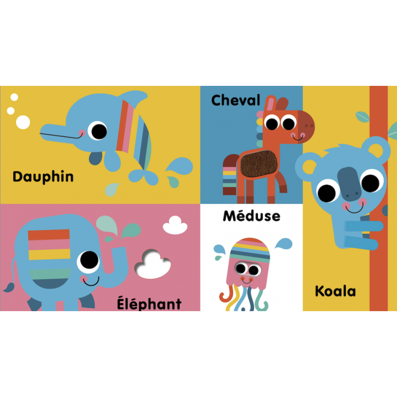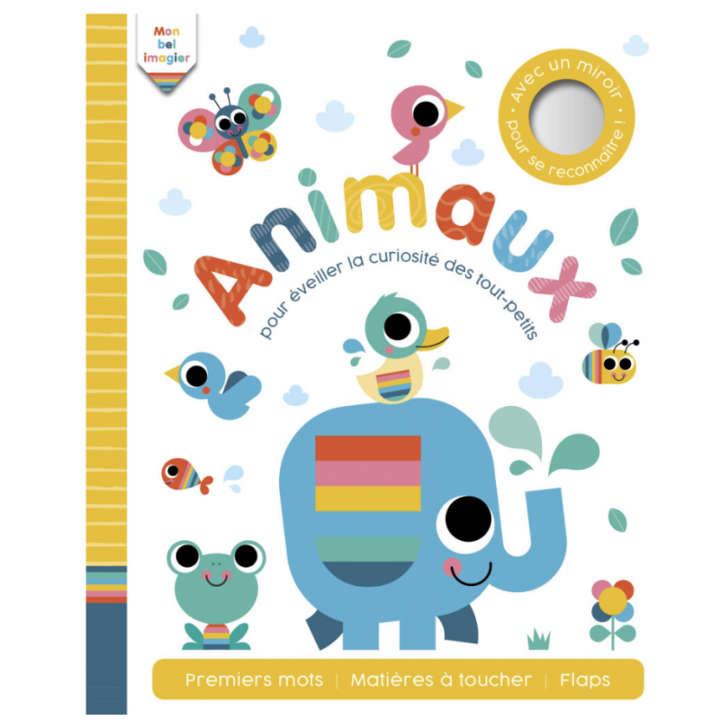La girafe, l’étoile de mer, le koala… dans ce beau livre d’éveil, bébé va faire connaissance avec 30 animaux très mignons ! Les dessins sont simples et colorés pour éveiller l’intérêt. Des surfaces tactiles sur toutes les pages, 5 matières à toucher (feutrine, peluche, papier pailleté…) et 5 découpes stimulent le sens du toucher. Un grand flap crée la surprise et un miroir invite les petits curieux à regarder leur frimousse pour des éclats de rire garantis ! Dès la naissance.