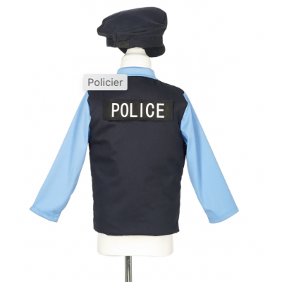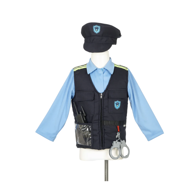 Officier, officier ! Aidez-nous s'il vous plaît ! Alors que le policier court après le voleur, il saute par-dessus tous les obstacles sur son passage. Il attrape le méchant, le menotte et tout est à nouveau en sécurité ! L'ensemble policier est composé à 80 % de coton (viste et chapeau) et à 20 % de polyester (manches et col). La longueur du gilet est de 49 cm (4-7 ans). Un chapeau d'officier assorti, des menottes, un talky-talkie-walkie et un bâton de police sont inclus dans l'ensemble. Sont également inclus 3 badges POLICE pour le dos en anglais, espagnol et allemand, que vous pouvez ajouter et/ou retirer avec velcrow.