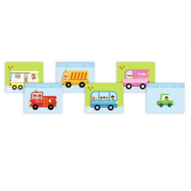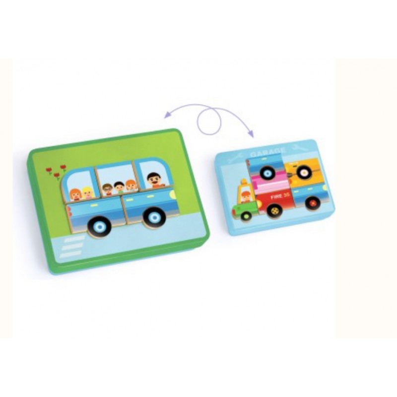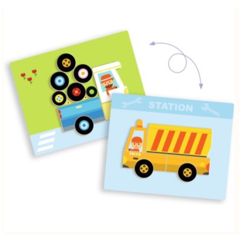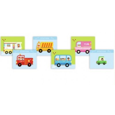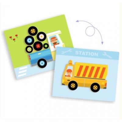 L'enfant joue avec des magnets en bois sur une boîte métallique fine. Il reproduit les 12 véhicules représentés sur les cartes en choisissant le bon côté de la boîte.