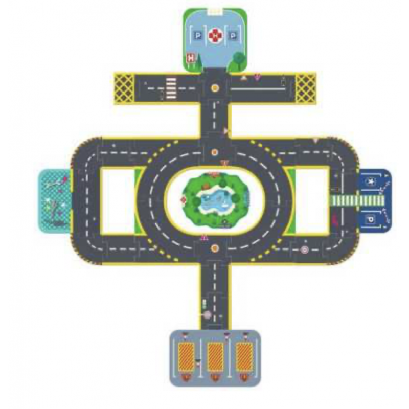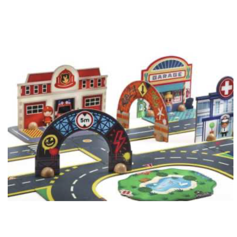 Un puzzle de sol complété par des éléments de décors montés sur des socles en bois pour jouer et se raconter des histoires. Une ville géante composée de 27 pièces de sol et de 6 éléments de décors incluant un hôpital, un poste de police, un garage, une caserne de pompiers et deux arches.