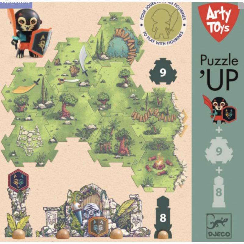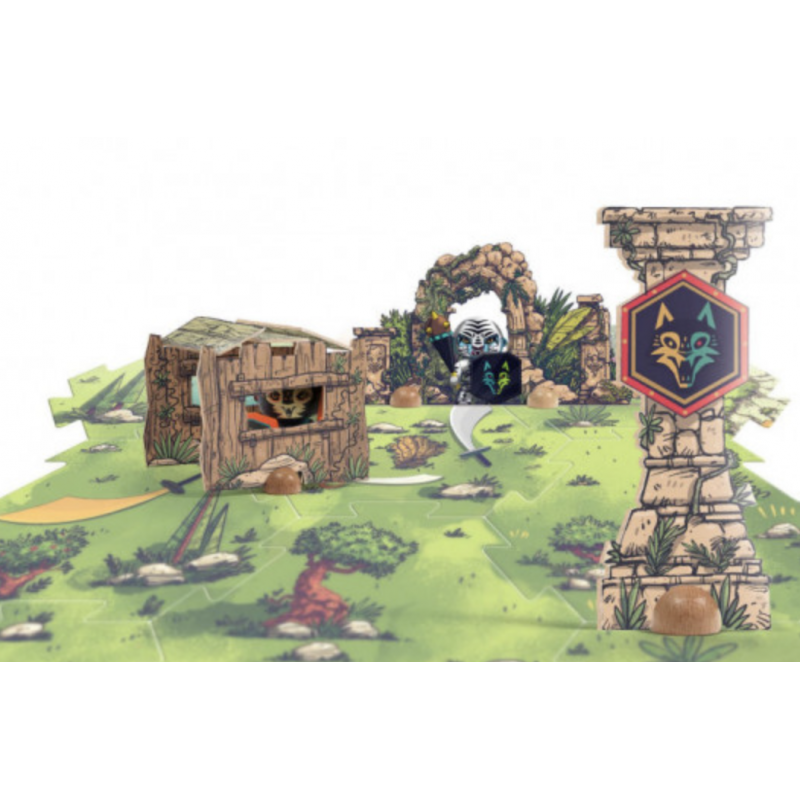 Ce magnifique puzzle de sol est composé de 9 grandes pièces hexagonales en carton très solide et faciles à assembler en toute liberté. Le jeu est complété par des éléments de décor verticaux montés sur des petits supports en bois (1 totem, 1 maison, 1 lieu de rassemblement), pour jouer et s'inventer des histoires.
