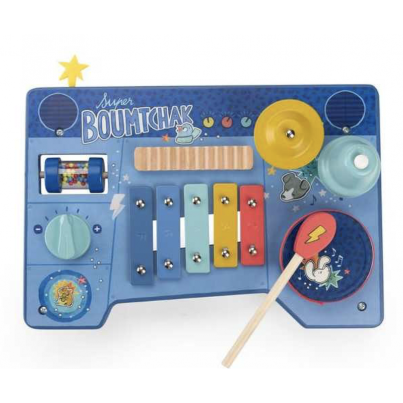 Le super boumtchak de Puce & Pilou est arrivé ! Taper sur le tambour, monter le volume, secouer les billes, faire tinter la cymbale…Une multitude d'activités à découvrir pour bébé. En bois et illustré, cette table musicale est facilement transportable.