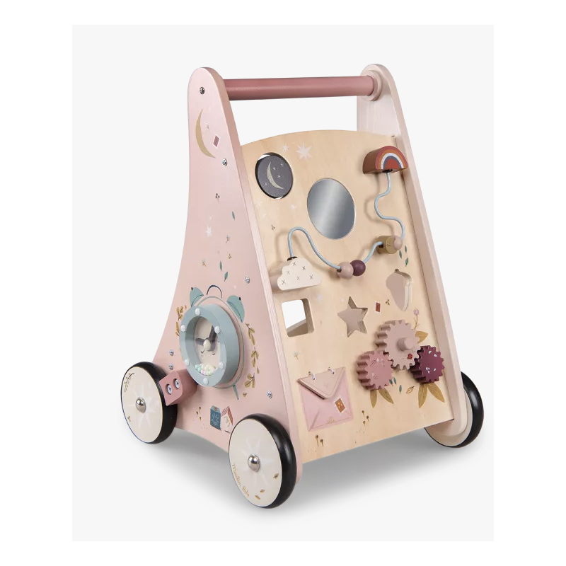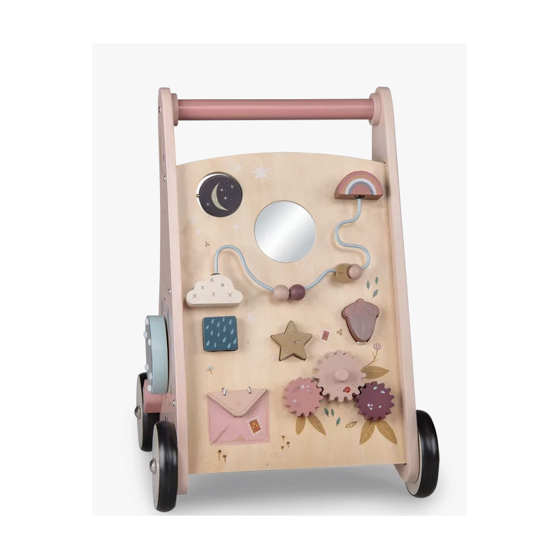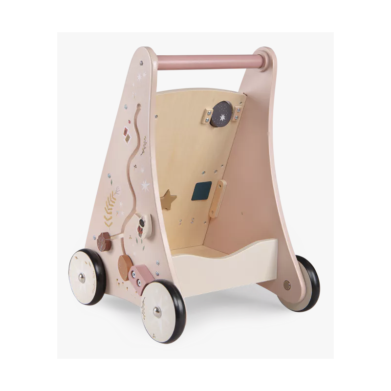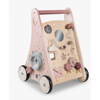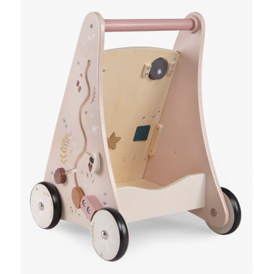 Chariot de marche antidérapant pour accompagner les premiers pas de bébé en toute sécurité. Décoré des illustrations poétiques de Lucille Michielli sur la nature, il dispose de 8 activités : labyrinthe coulissant, engrenages, encastrages,... Le kit de 3 formes ainsi que la pièce fond de chariot de marche, sont disponibles en pièces détachées.