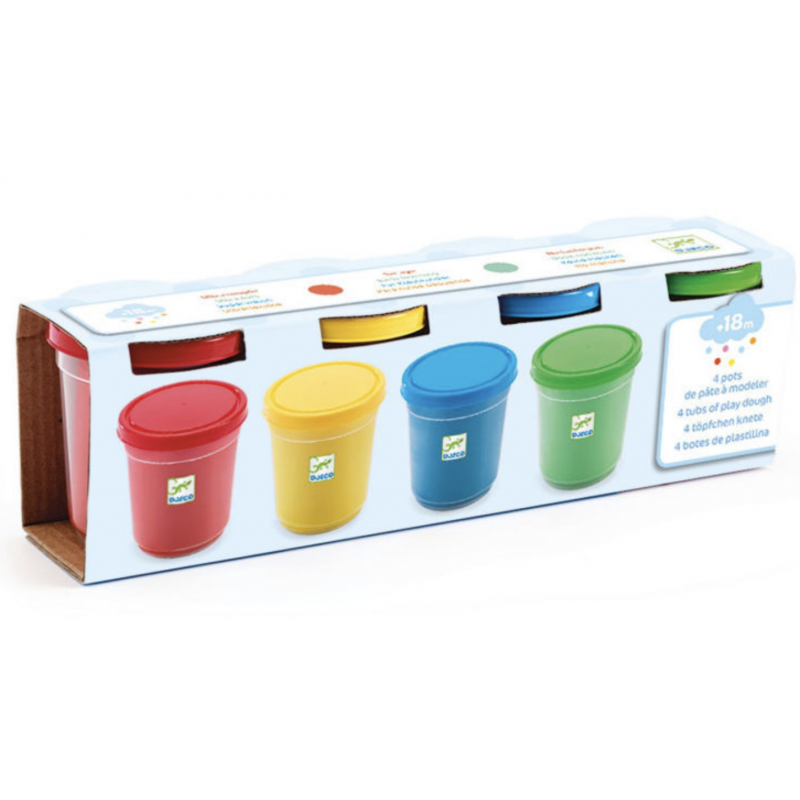 4 pots de pâte à modeler adaptée aux tout-petits, ultra souple et qui ne tâche pas.