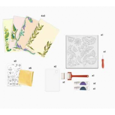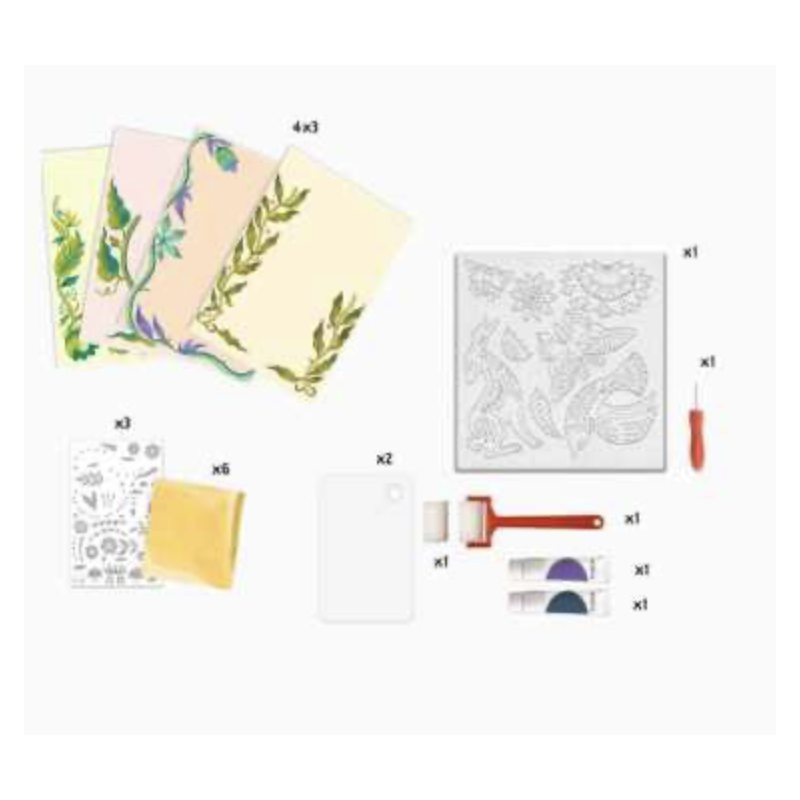 Cette activité d'initiation à la gravure comprend une planche d'éléments en polystyrène à orner de motifs en creux. L’enfant se munit de l'outil non contondant et crée des lignes et points en relief. Puis, il utilise ses créations comme des tampons à l'aide de la peinture fournie pour réaliser 12 cartes à sa guise. Il vient parfaire ses créations de touches métallisées grâce aux patchs collants, sur lequel il transfère la matière brillante.
