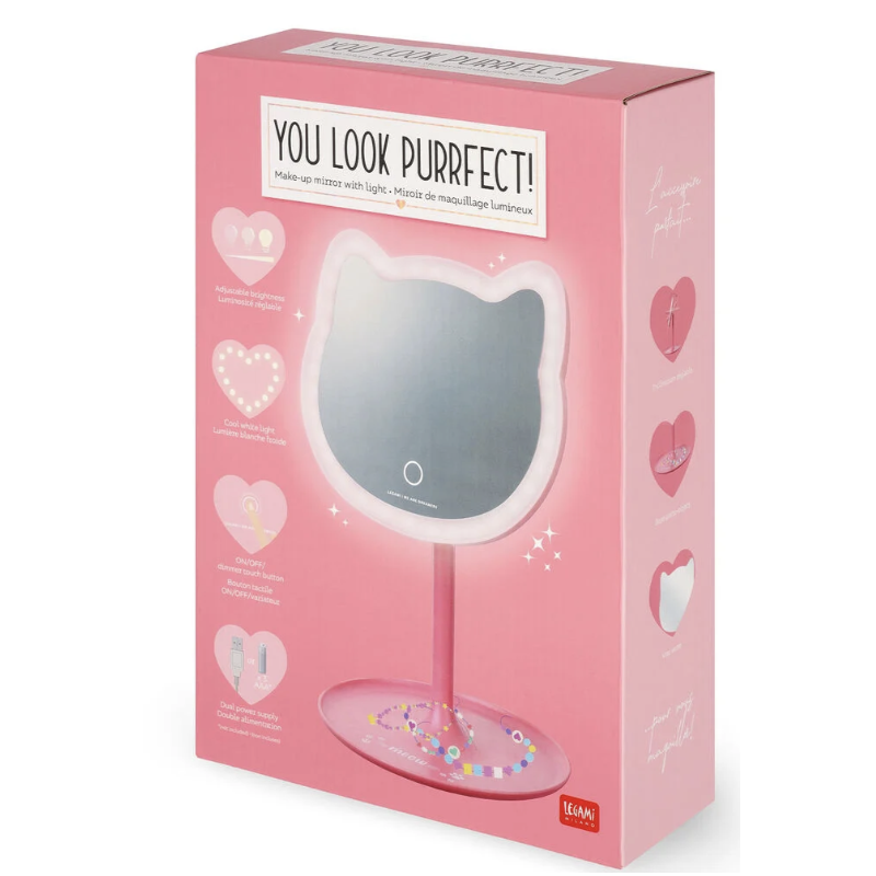 Regardez-vous comme vous regarderiez un chaton à la recherche de caresses ! Rien de plus facile grâce au le Miroir de Maquillage Lumineux - You Look Purrfect! de Legami. Réglez la luminosité pour vous voir au mieux, utilisez la base porte-objets pour poser vos bijoux et vos petits accessoires de maquillage et préparez-vous à ronronner !
