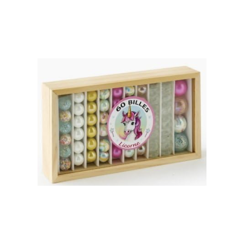 Coffret Kim Play de 60 billes en bois thème « Licorne », multicolores et scintillantes. Coffret robuste pour jeux classiques, collection ou activité ludique en plein air dès 3 ans. Format pratique à emporter.