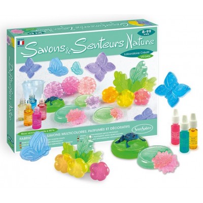 Ce coffret de DIY cosmétique aux formules végan permet de faire de beaux savons multicolores sur le thème de la nature : nénuphar, lotus, papillons ou grenouilles.