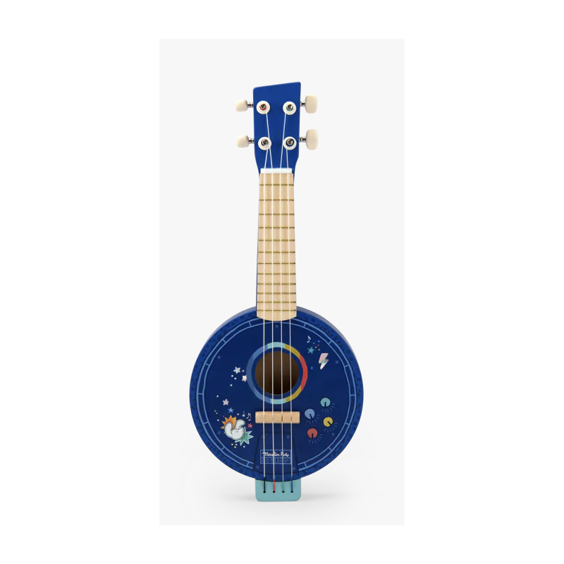 Banjo en bois à 4 cordes en métal pour nos apprentis musiciens. L'instrument est orné d'une peinture holographique bleue ponctuée des couleurs éclatantes de l'univers de Puce & Pilou. Fabriqué en bois, il est léger et de taille idéale pour les enfants.