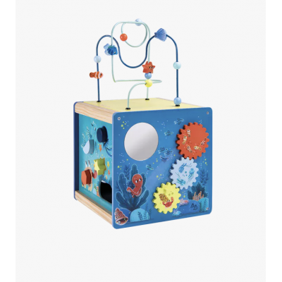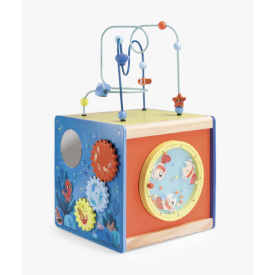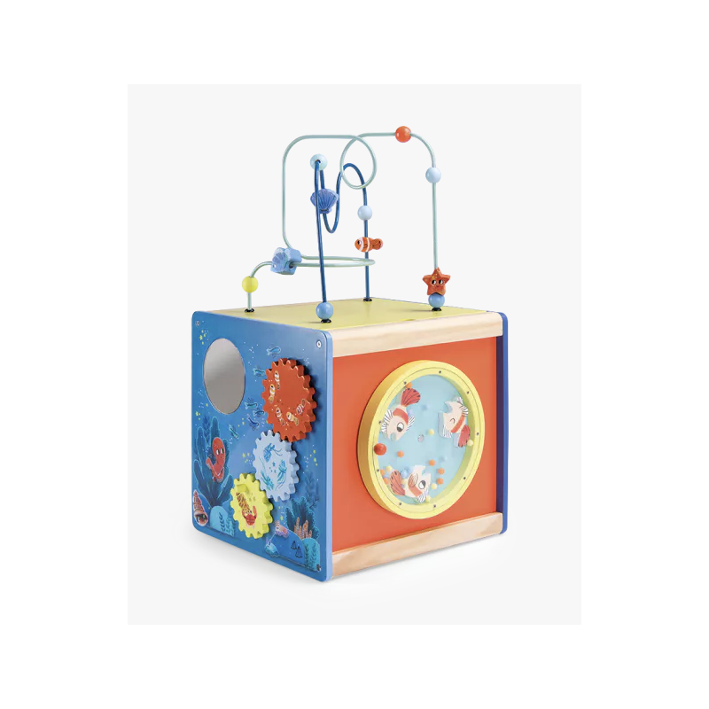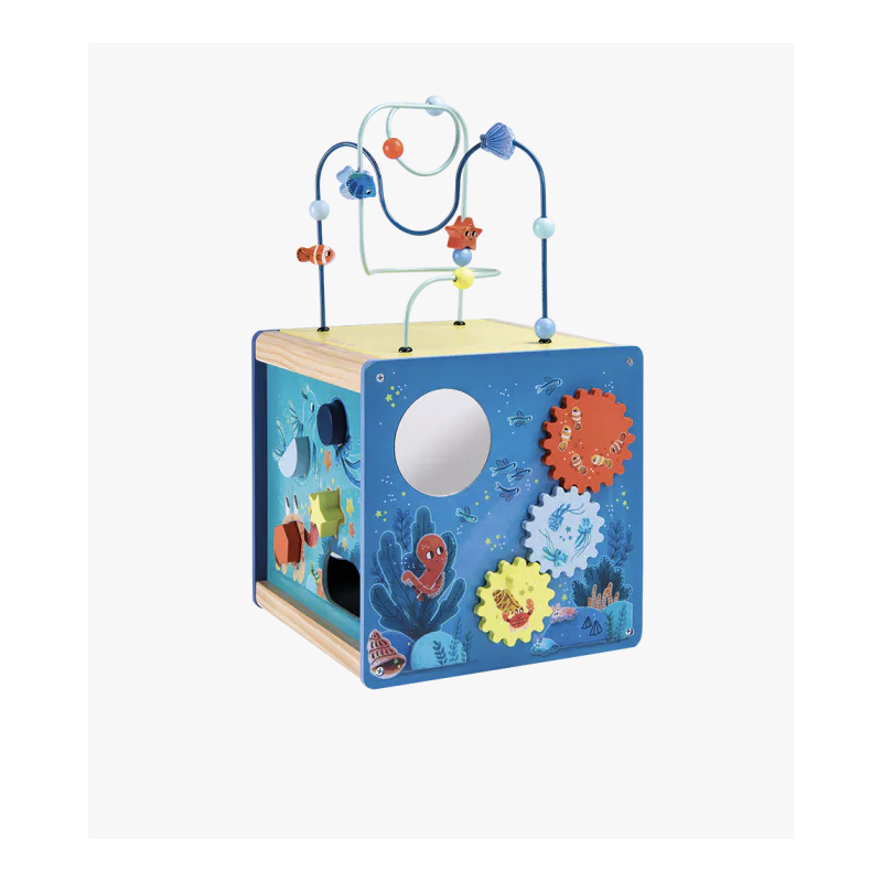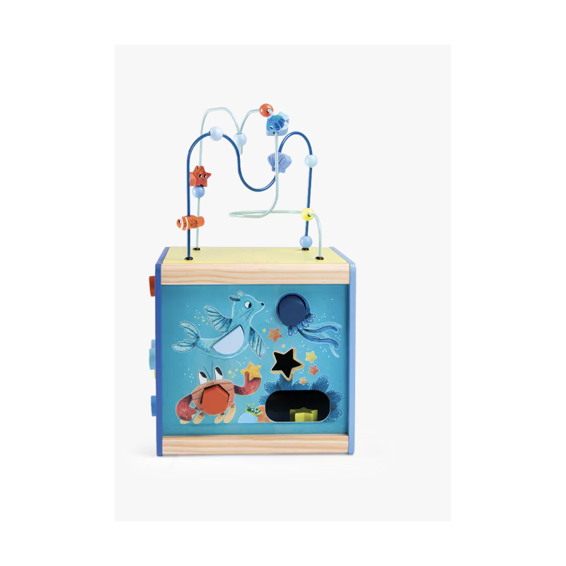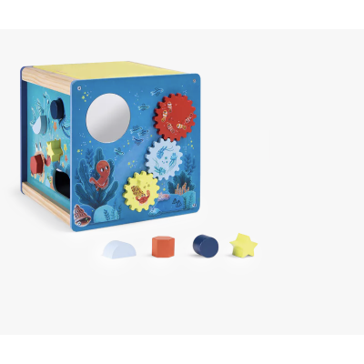Ce cube en bois coloré invite bébé à jouer avec les animaux marins : Labyrinthe coulissant, jeu à formes, engrenages, boulier…. il prendra plaisir à découvrir les activités et les sons. Pratique, le couvercle se range à l'envers dans le cube. Le kit de 4 formes pour le cube d'activités en bois en disponible en pièce détachée.