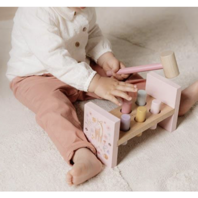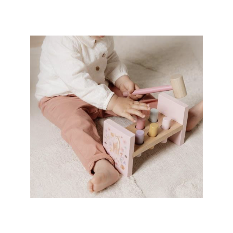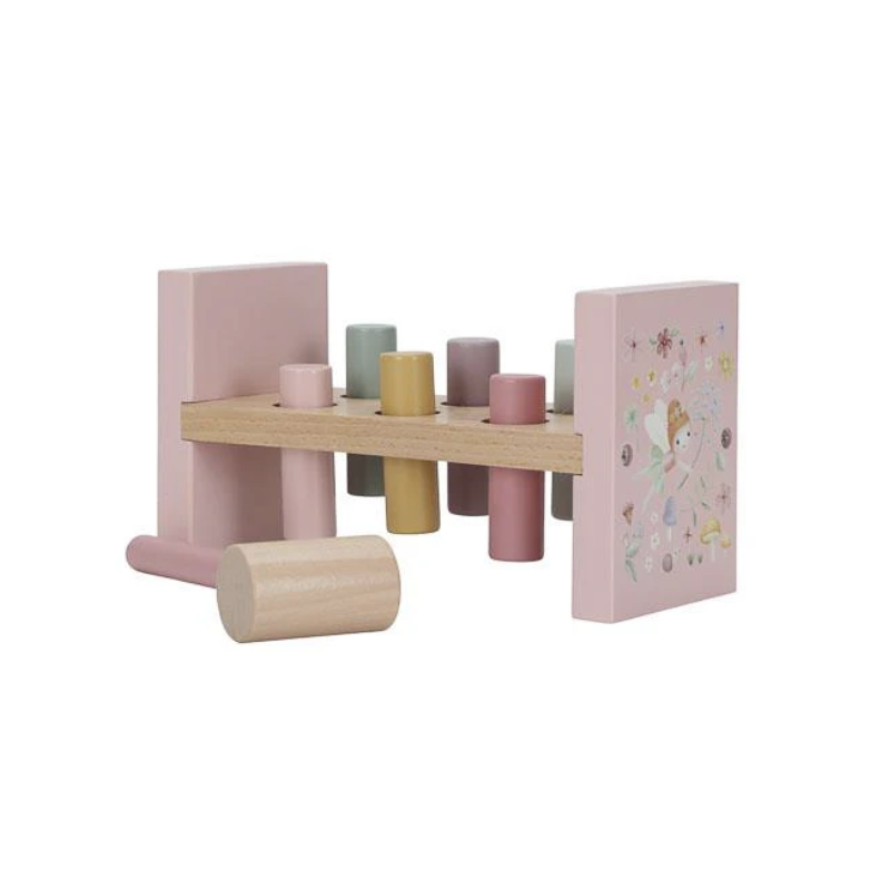 Tic tic tic ! Utilisez le marteau pour enfoncer les 6 bâtonnets colorés dans le banc à marteau en bois et explorez la magie de Fairy Garden. Tous les bâtonnets sont-ils enfoncés ? Retournez le banc et recommencez ! C'est un bon exercice pour la motricité qui occupera bien votre enfant.