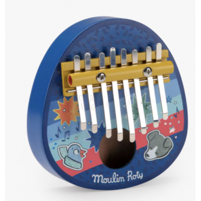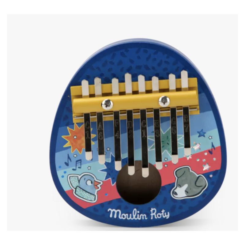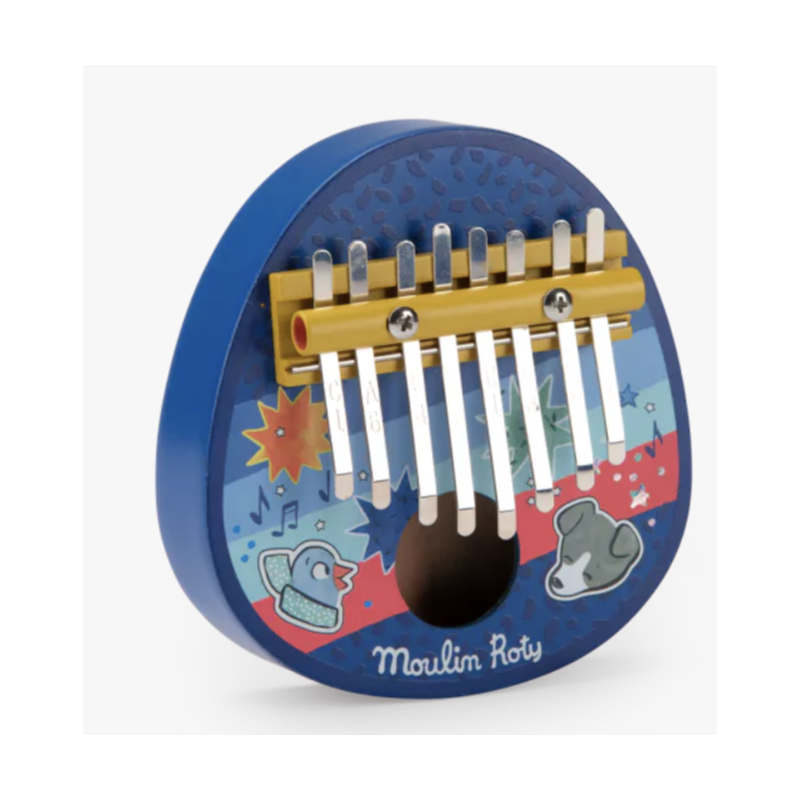 Kalimba en bois peint et lamelles métalliques, aux couleurs urbaines et vintage de Puce & Pilou. Cet instrument développe le rythme et l'éveil musical des tout-petits, avec des sons très doux.