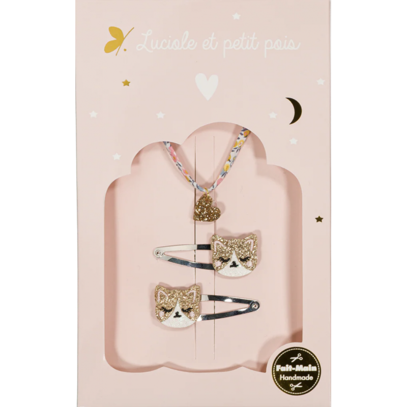 Ce coffret Pompon réunit les adorables barrettes Kitty le chat et un délicat bracelet Liberty Wiltshire Bud avec un cœur doré. Parfait pour les amoureuses des félins et des accessoires doux.