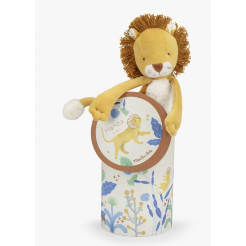 Le gentil lion Mamba est tout le temps disponible pour une séance de câlins. Sa jolie crinière et sa belle fourrure blanche en font un vrai copain pour les tout-petits. Il loge dans une boîte joliment illustrée à l'aquarelle par Élodie Coudray.