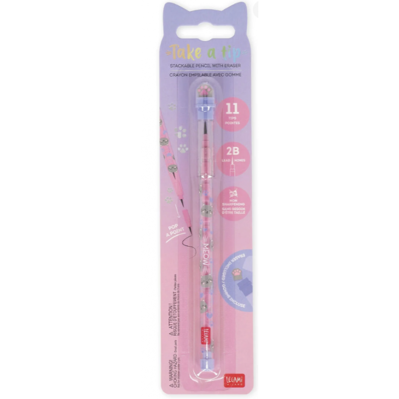 Tu voudrais que ton crayon se mette en 4 pour toi ? Le Crayon Empilable avec Gomme - Take a Tip - Kitty de Legami fait encore mieux : il se met littéralement en 11 pour être toujours prêt, sans besoin de taille-crayon. Coloré, amusant et super pratique, il est parfait pour les enfants et pour l'école.