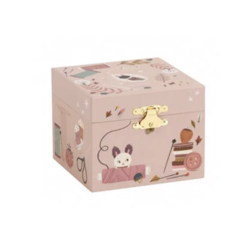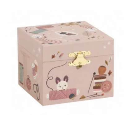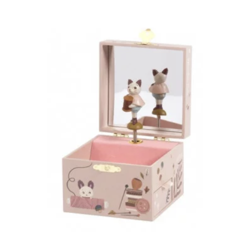 Ouvre la boîte et regarde tourner le chat et sa bobine de fil, sur une douce mélodie… Sur le côté, un petit tiroir permet de ranger ses précieux secrets…