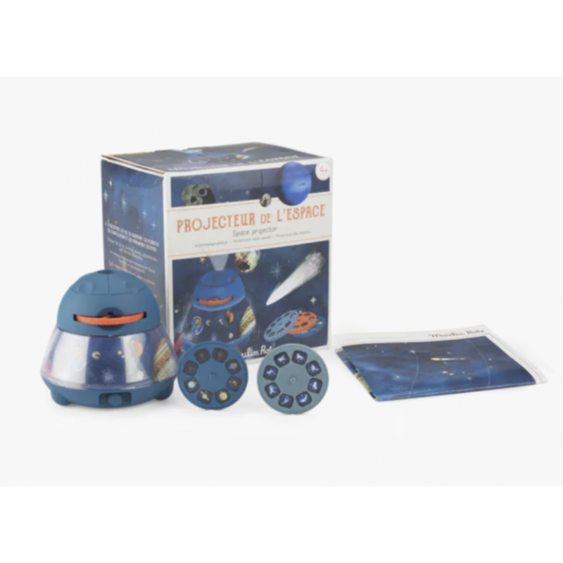 Le grand projecteur de l'espace permet de projeter planètes, constellations et comètes au mur ou au plafond. Avec ses 3 disques de 8 diapositives, l'enfant pourra découvrir le monde spatial ! Il se recharge via USB. Poster et livret d'instructions inclus.
