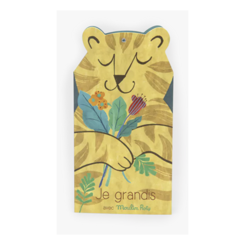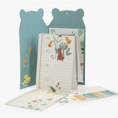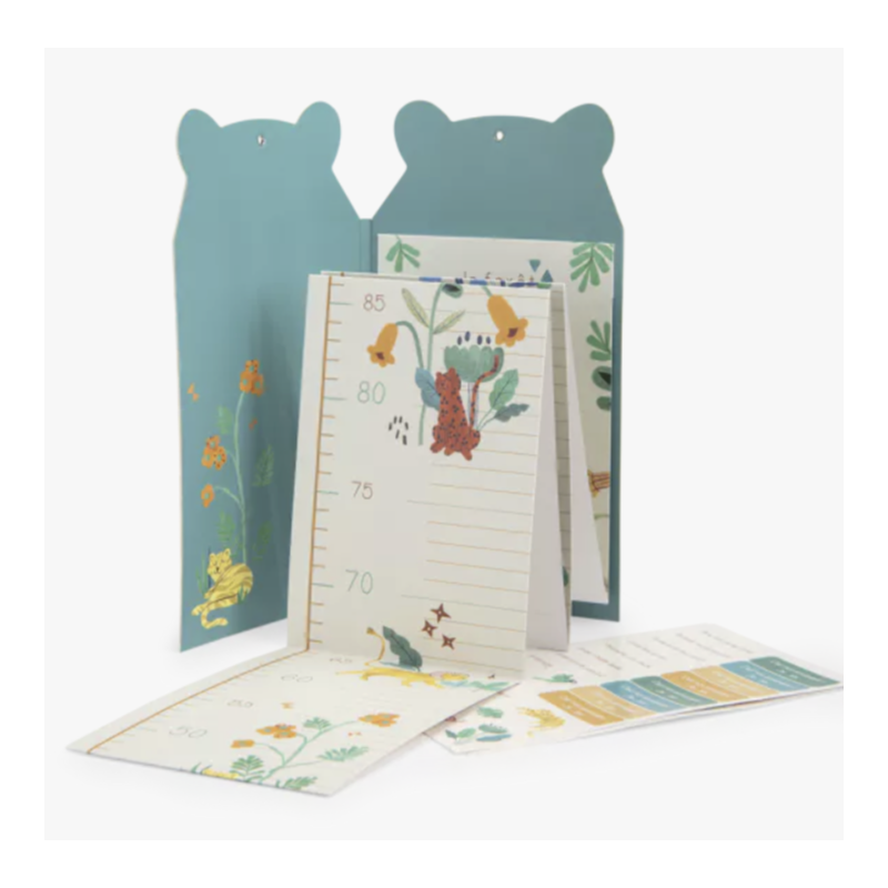 Toise en carton avec stickers personnalisables aux couleurs de la forêt Mawa. Présentée sous la forme d'un carnet, elle se déplie pour devenir un ravissant accessoire déco pour y noter la taille de bébé mais aussi toutes les anecdotes le concernant.