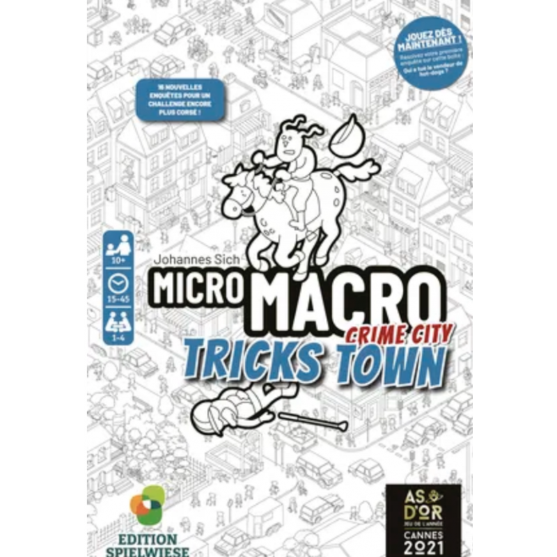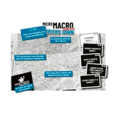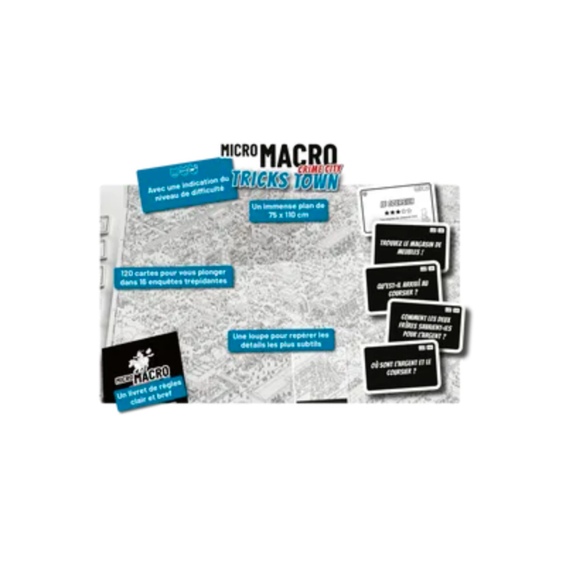 On ne s’en lasse pas ! Tricks Town c’est le troisième volet de l’aventure Micro Macro et toujours un plaisir identique de découvrir cette immense carte (75x110) et ces petits personnages inexorablement attirés par le crime. On reste sur la même mécanique un jeu d’enquête coopératif, mais le décor est différent puisque cette fois-ci ce sera le quartier sud-est de Crime city qu’il faudra scruter à la loupe pour résoudre 16 nouvelles affaires.