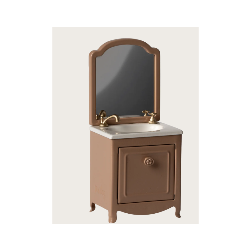 Un élément indispensable pour la salle de bains des souris. Il comporte un rangement sous l'évier et, bien sûr, un joli miroir. Ajoutez les toilettes et la baignoire Maileg pour compléter le jeu.