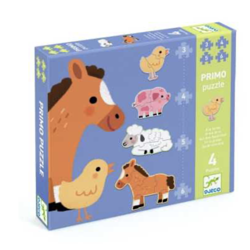 Découvrez Primo puzzle À la ferme de Djeco, un coffret de 4 puzzles évolutifs et silhouettés sur le thème des animaux de la ferme, conçu pour les enfants dès 2 ans.