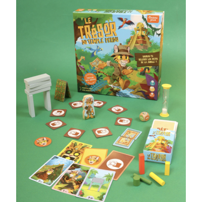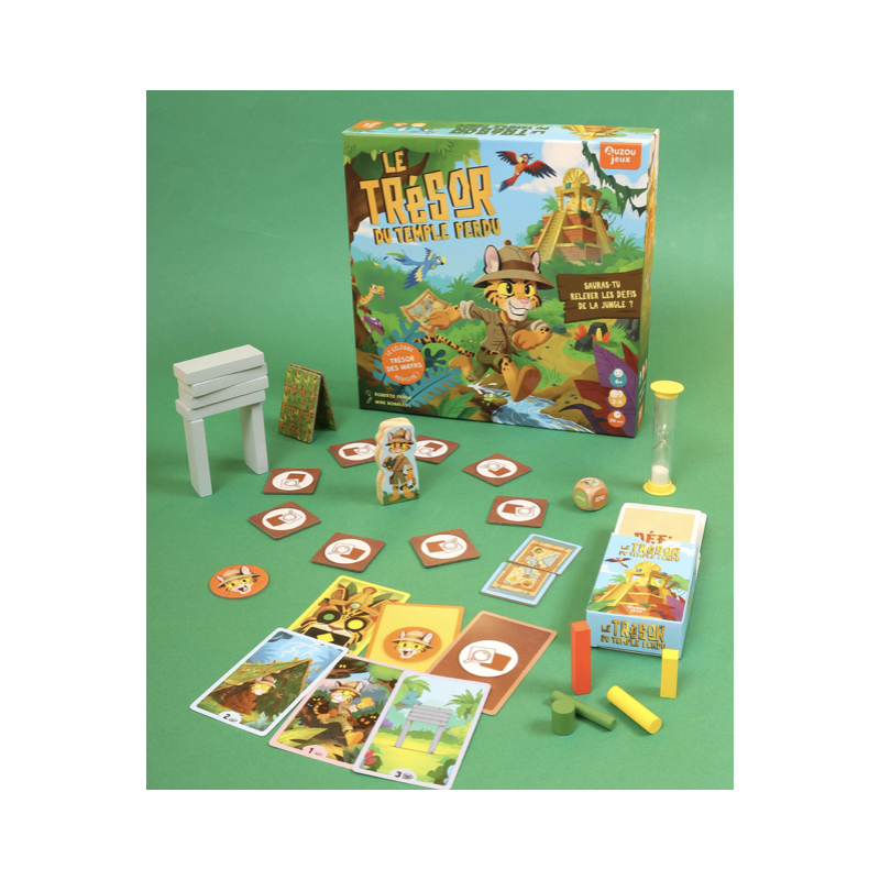 Contenu : 1 pion Aventurier – 1 jeton Chance – 10 tuiles Exploration – 74 cartes Défi – 2 tuiles Abri – 1 dé en bois – 1 sablier – 6 blocs Temple en bois – 5 formes Masque en bois