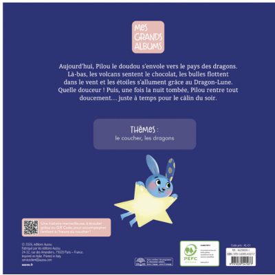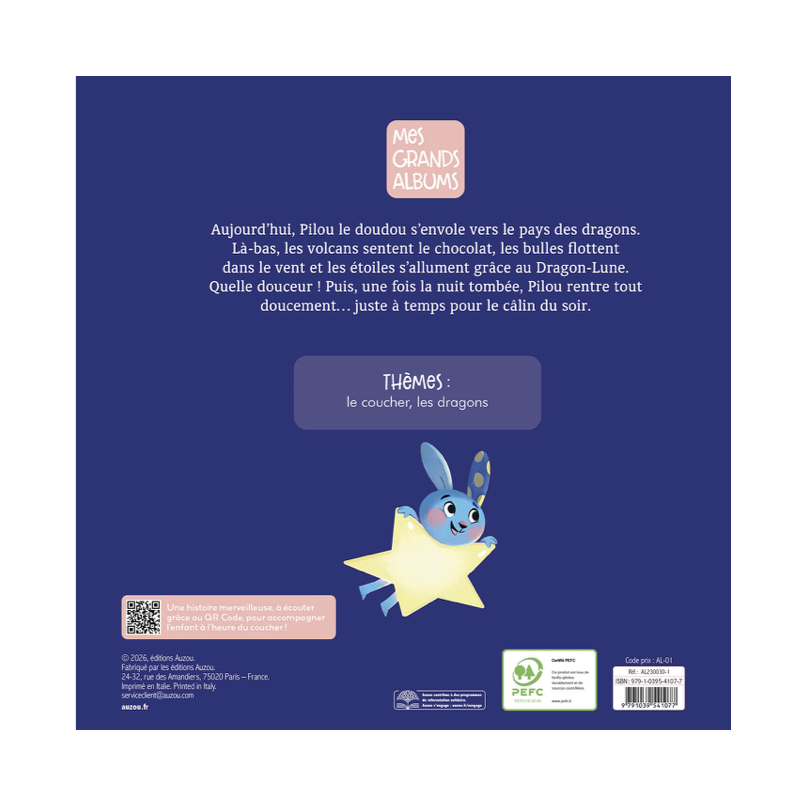 Pilou voyage au pays des dragons. Il rencontre Choco-Dragon, le petit Dragon-bulle, Dragon-Pluie ou encore Dragon-Lune. Et il sera de retour, juste à temps pour le câlin du soir.