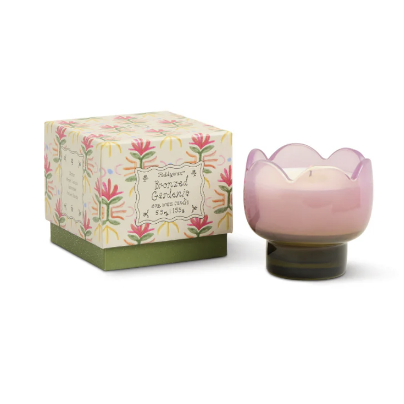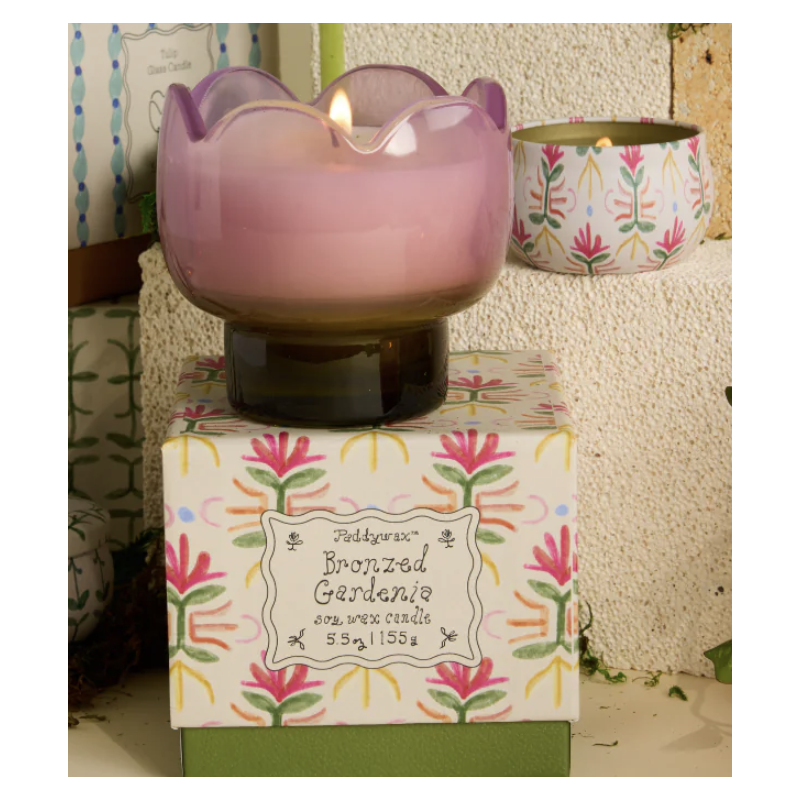 Chaque bougie est présentée dans une boîte coulissante illustrée, dont les motifs sont assortis à chaque bouton de fleur. En bonus : une adorable petite bougie en métal, parfaitement coordonnée à la tulipe en verre.