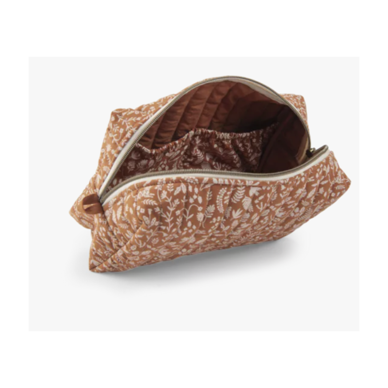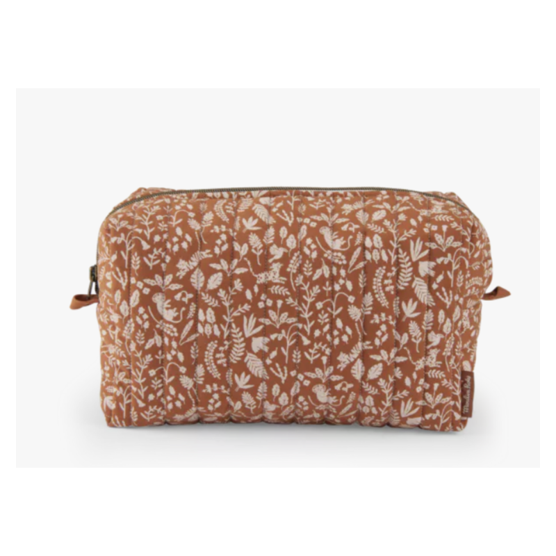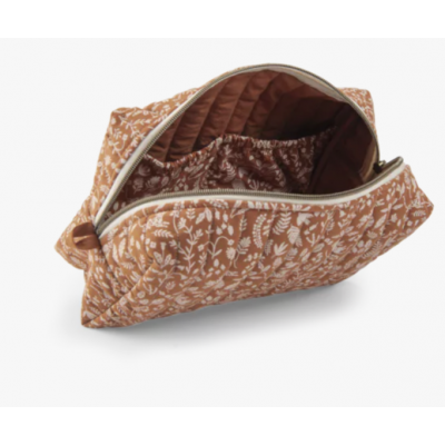 Trousse de toilette avec un imprimé feuillage. Nomade avec une fermeture cuivre zippée, elle est une belle pièce qui complètera le nécessaire de bébé pour une toilette pratique et poétique.