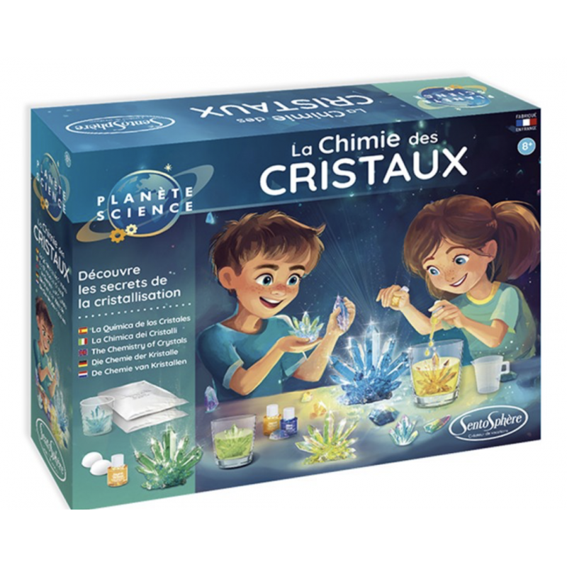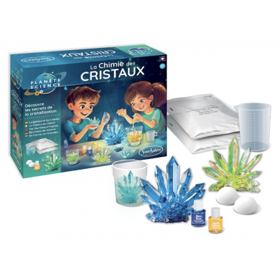 Ce coffret vous permettra de créer de magnifiques cristaux et de comprendre le phénomène complexe de la cristallisation. Grâce aux 2 colorants fournis, créez le cristal de votre couleur préférée : émeraude, citrine ou aigue marine !