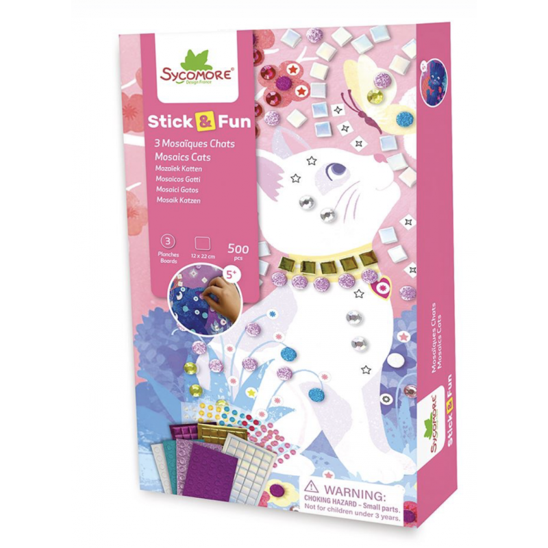 Réalise 3 adorables tableaux de chats en mosaïque! Colle les petits carrés de mousse colorée sur les modèles pour créer des images scintillantes et faciles à réussir. Une activité relaxante, parfaite pour initier les enfants à la patience et à la minutie. Contient : 3 planches illustrées et plus de 500 mousses autocollantes et joyaux.
