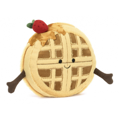 Dorée à point, cette gaufre arbore un élégant nappage de sirop satiné, surmonté d’une fraise texturée. Son large sourire brodé et ses bras en velours côtelé font de cette petite douceur matinale le compagnon idéal pour commencer chaque journée du bon pied !