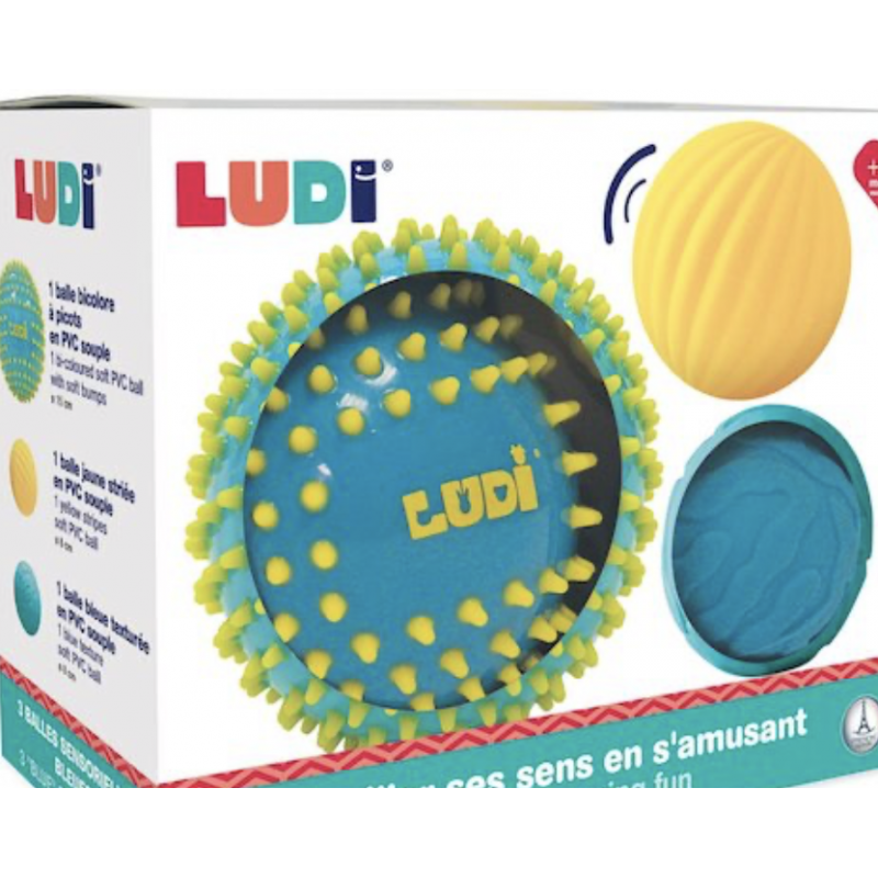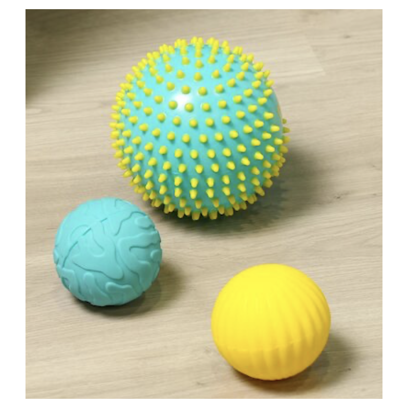 Le coffret comprend : 2 petites balles nervurées au toucher velouté pour plus de douceur et 1 grande balle bicolore, à picots tendres pour les massages ou parties de chatouilles.