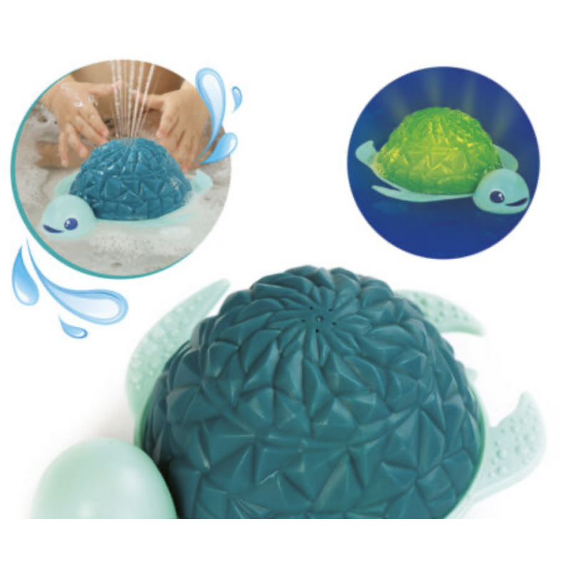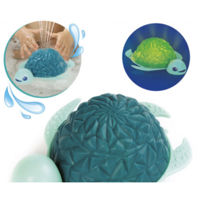 La tortue Ludi Splash est un jouet de bain lumineux qui projette des jets d’eau et illumine sa carapace au contact de l’eau, offrant une expérience sensorielle, ludique et interactive dès 10 mois.