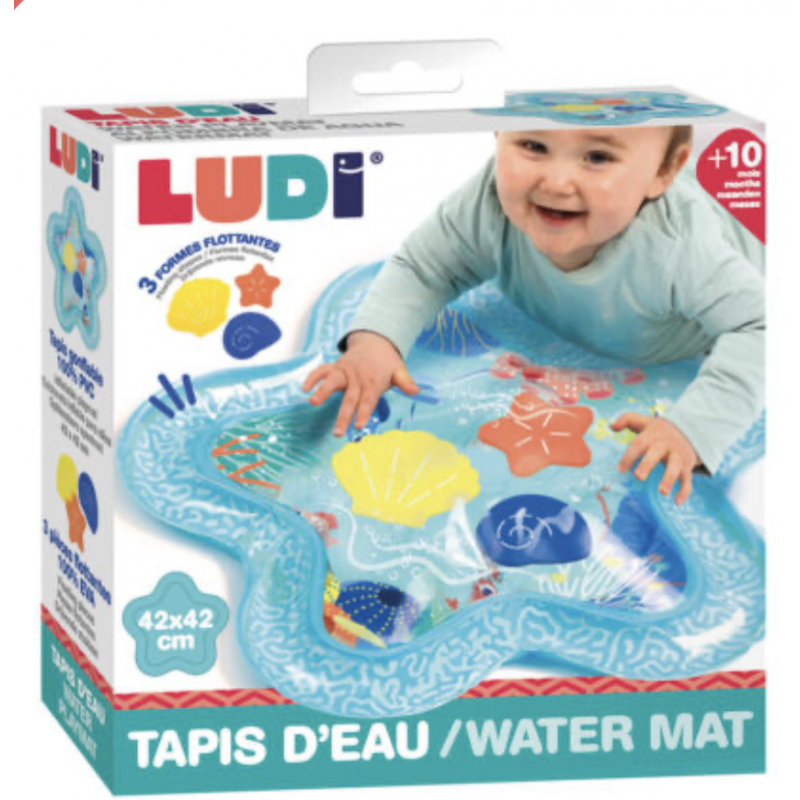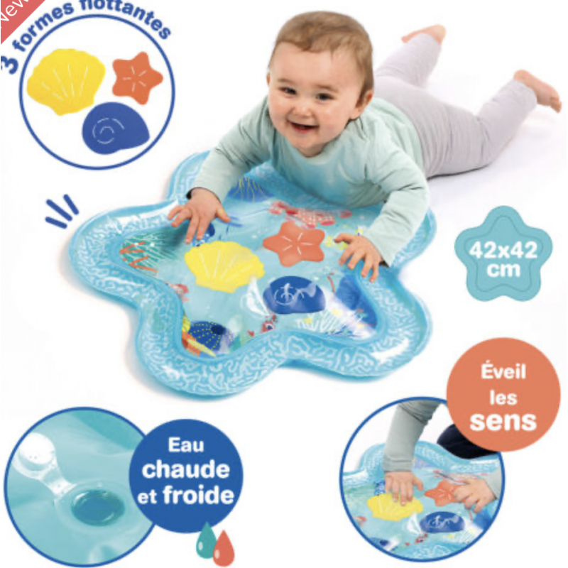 Tapis d’eau étoile avec jouets flottants à attraper, conçu pour stimuler la motricité, la coordination œil-main et l’éveil sensoriel. À presser pour faire circuler l’eau, utilisable avec eau chaude ou froide dès 10 mois.