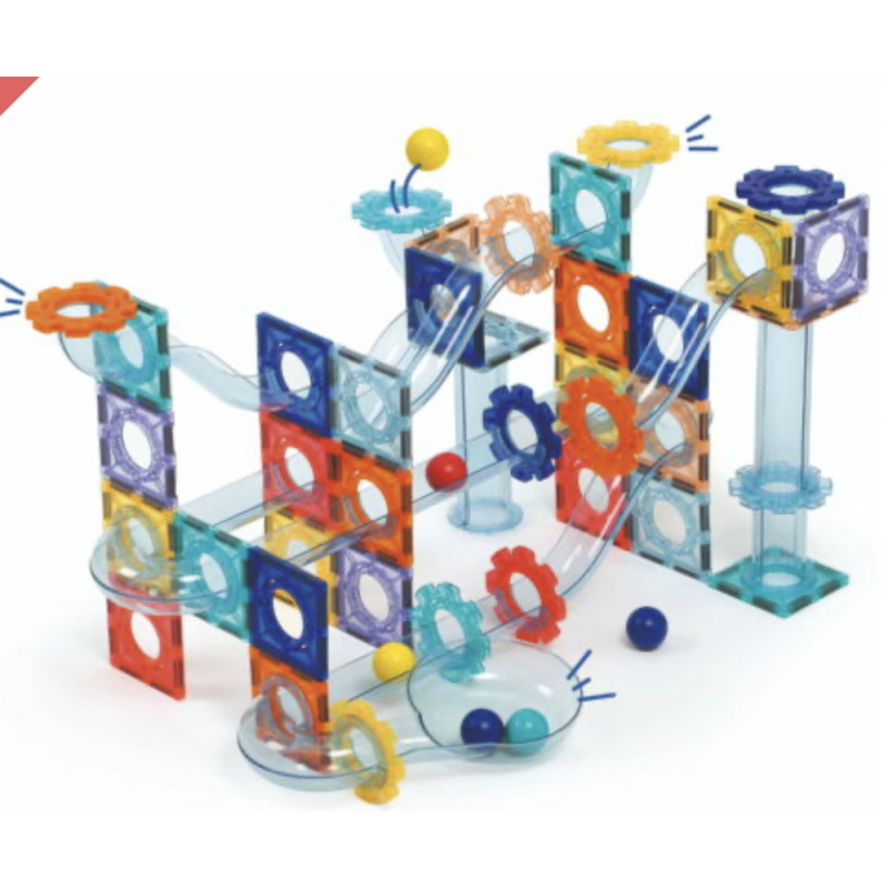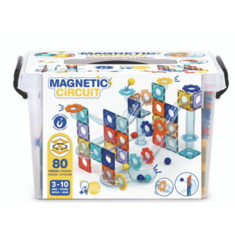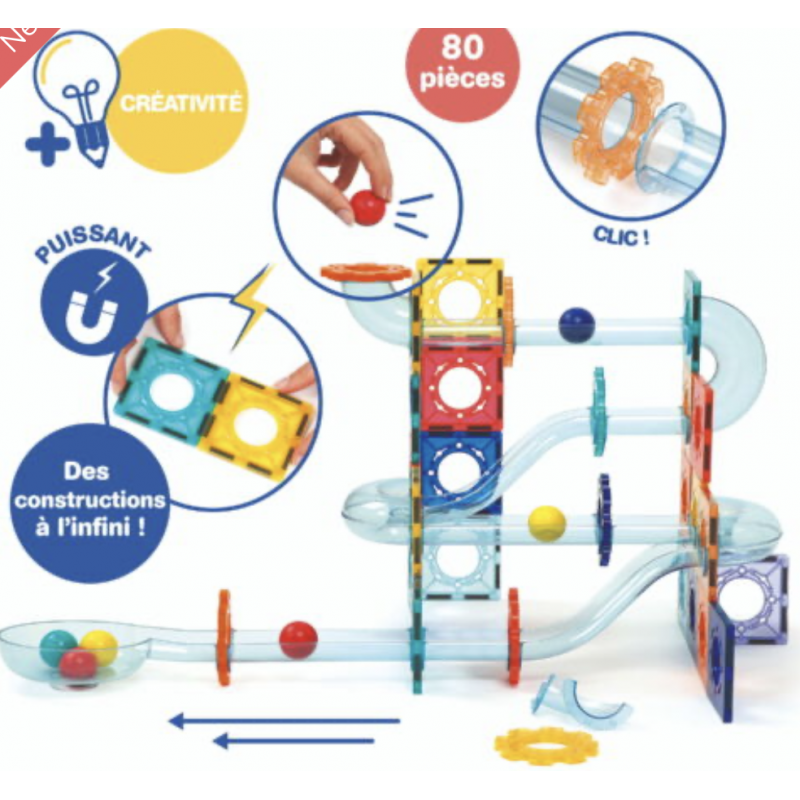Circuit à billes magnétique avec plaques aimantées, pièces de parcours et billes pour créer des constructions en 2D et 3D. Stimule la logique, la motricité fine et l’éveil scientifique dès 3 ans.