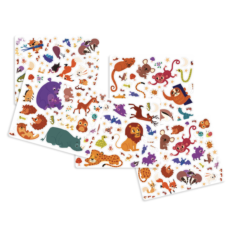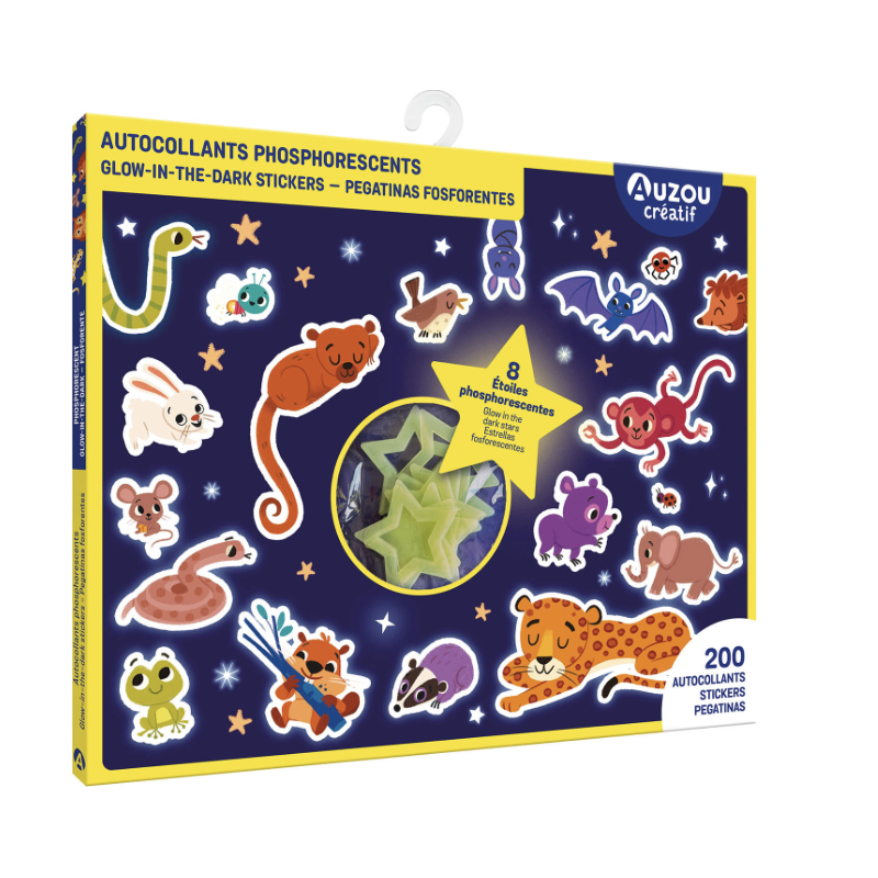 Découvre un magnifique poster de forêt à décorer avec 200 autocollants qui brillent dans le noir ! 8 étoiles et lunes à accrocher au plafond sont aussi incluses !