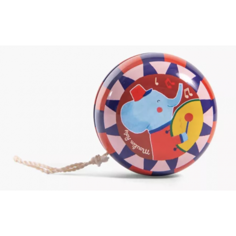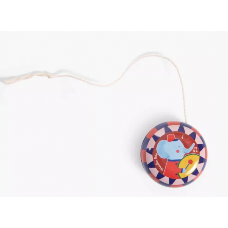Yoyo en métal comme à l'époque ! Couleurs et motifs rétros entourent un joyeux éléphant musicien, prêt à tournoyer dans les airs !