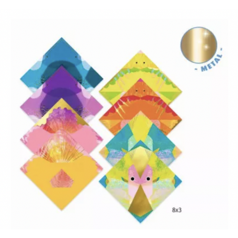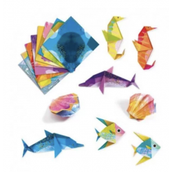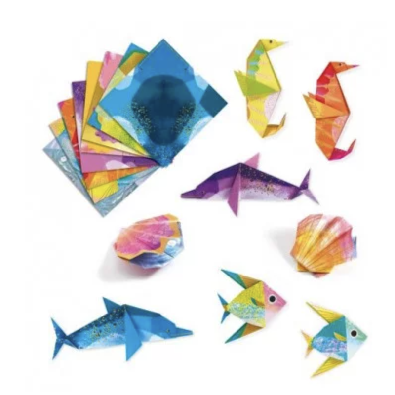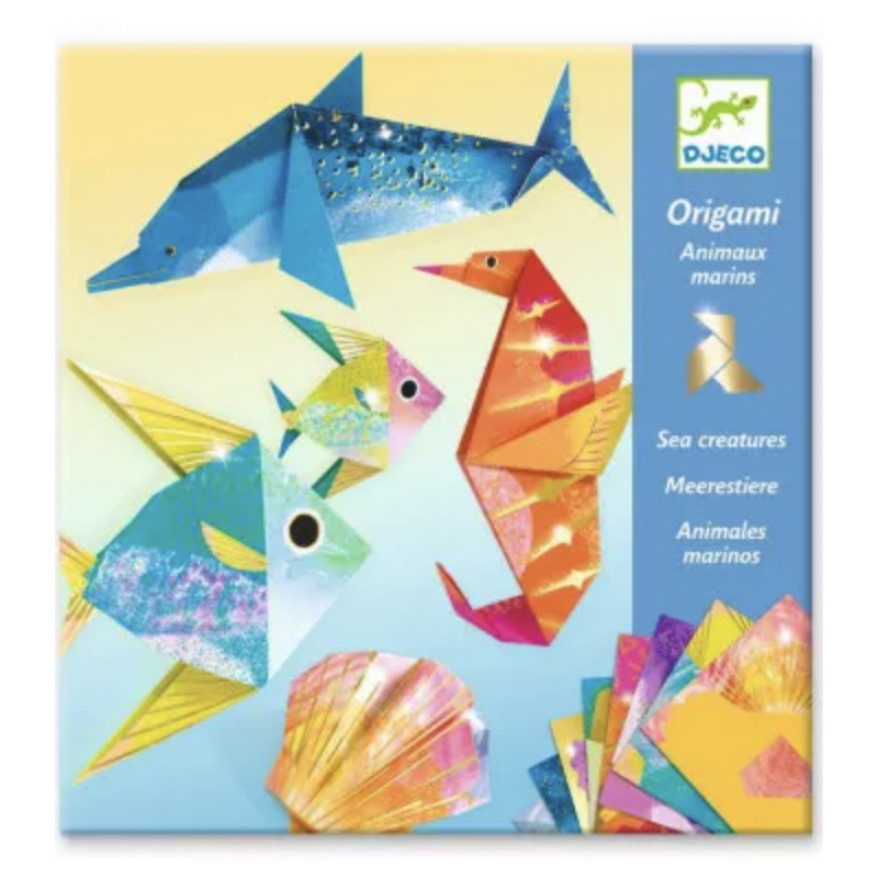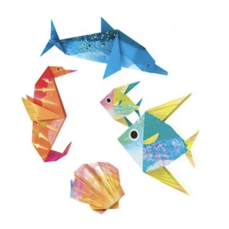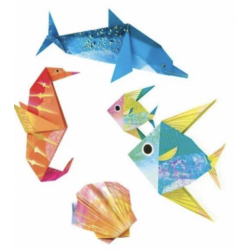 Découvrez la pochette origami animaux marins de Djeco pour les enfants à partir de 6 ans, une activité de pliage pour réaliser 24 créations aux effets métallisés représentant des animaux et des végétaux marins avec un hippocampe, un coquillage, un dauphin et un poisson.
