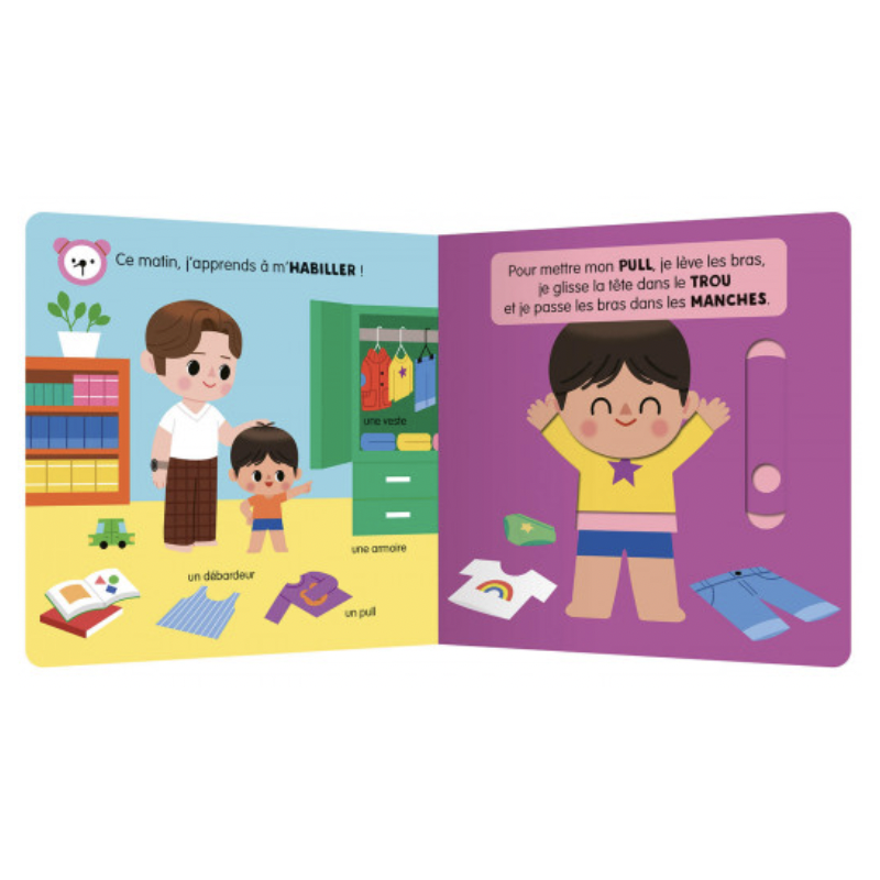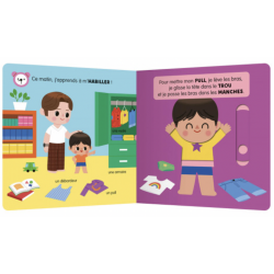 La thématique de l'habillement est mise en lien avec le quotidien de l’enfant pour une reconnaissance immédiate. On retrouve toujours 5 mécanismes solides, logiques et adaptés aux petites mains, faciles à manipuler, et une double finale qui récapitule les apprentissages de façon ludique, grâce à un jeu de flaps.