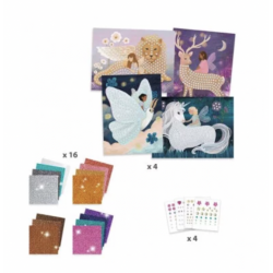 Un coffret pour s’initier à l’art de la mosaïque. 4 tableaux à décorer en collant des petits carrés de mousse pailletée et des strass. L’enfant repère les numéros, puis colle les pièces correspondantes à l’emplacement désigné. Les tableaux se remplissent et le monde enchanté se pare de rayons chatoyants.