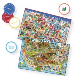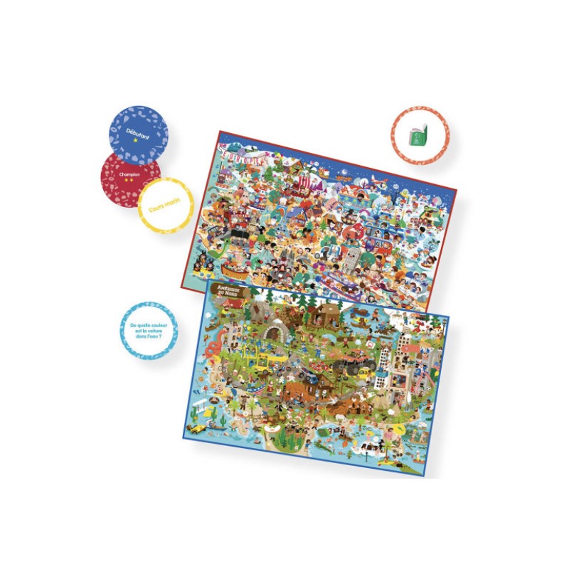 Mets à l'épreuve ta rapidité et ton sens de l'observation dans ce jeu de cherche et trouve géant ! Deux plateaux de cherche et trouve, quatre-vingt éléments à retrouver dans chaque scène et 3 niveaux de difficulté: débutant, champion et super champion !