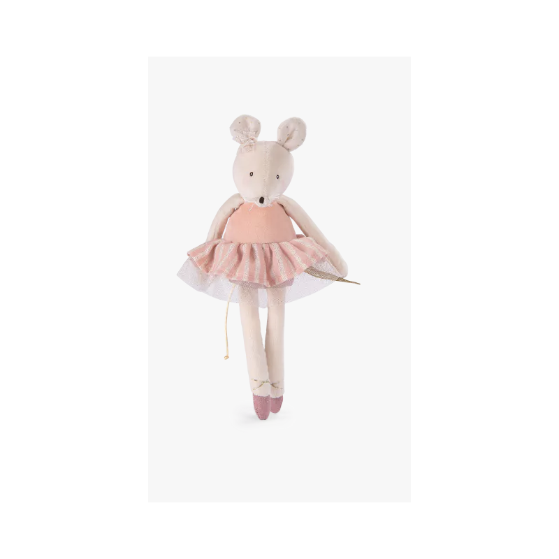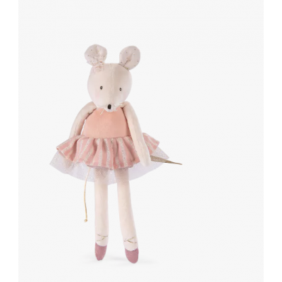 Petite souris en velours au doux visage brodé ! Joues poudrées, jupe tutu rayée rose, petit nœud sur la tête et ballerines nouées, elle est d'une grande élégance. Facile à attraper par les petites mains, elle deviendra le compagnon privilégié de bébé.