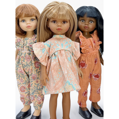 Corps de 32 cm en vinyle, sans phtalate, cheveux avec frange implantés à la main, yeux fixes avec cils et sourcils peints.